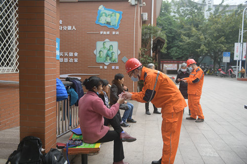 2月17日,下午1.30,国网四川省电力公司泸州市泸川供电分公司城区供电服务分中心书记、副主任,龙城共产党员服务队队长周凤丹带领队员王堂君、舒文忠、雷浩强来到泸县县城花园干道地税小区灾后重建的两栋楼房,对变压器、配电箱、电表箱等电力设施进行电力线路体检,确保地震灾民迁入新居后用电无忧。