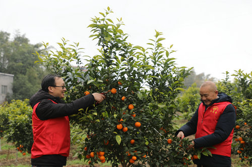 “薛湾村地处泸州市泸县与重庆荣昌区交界地,有万亩五仙山天然林场、濑溪河及支流川境而过,气候温和,有着先天的优势。”泸县方洞镇薛湾村党总支部书记刘安华说道,三年前,为有效盘活资源,村集体经济组织通过流转撂荒地、坡地400余亩,引进种植精品柑橘品种'901无核沃柑',积极推进乡村振兴发展。今来满树红果,无核沃柑迎来了初丰收。