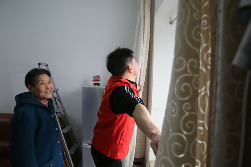 从张肇莲家出来后,志愿者们又前往独居老人家杨启芬家中,帮助她挂上脱落的窗帘。趁着志愿者们挂窗帘的空档,莲花池街道关口社区居委会副主任许灵灵走到门边,检查门磁能否正常使用。“我们在独居老人的门前都安装了门磁,老人每次从门边经过,就会有一条信息发送到我们的终端上。如果我们两天没有收到信息,我们就会打电话或者上门访问老人,确保老人身体无碍。”许灵灵介绍说。