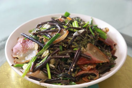 蕨菜炒腊肉是当地人最传统的吃法。将采摘到的新鲜蕨菜掐去老杆,清水洗去表面绒毛,开水下锅,小火煮熟,放入清水中浸泡后,捞出沥干,切成小段备用。农家腊肉切成薄片,下入油锅炒香,再将备好的辣椒、蒜、蒜苗等调料,与处理好的蕨菜一起下锅,大火翻炒,烟雾弥漫间,布满了烟火气。蕨菜去除了腊肉多余的油腻感,腊肉又赋予了蕨菜更丰富的味道,使得蕨菜清香滑润,口感爽脆,腊肉咸香四溢,肥而不腻,吃起来唇齿留香,深受当地人喜爱。
