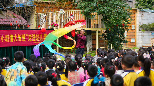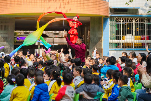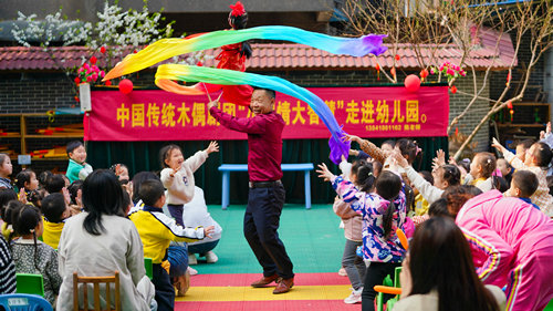 四川新闻网消息 2023年3月10日,在四川省泸州市龙马潭区小市幼儿园内,当地的非遗木偶戏传承人正在进行木偶戏表演,与小朋友们一同体会以偶传情、人偶共情的非遗雅趣。