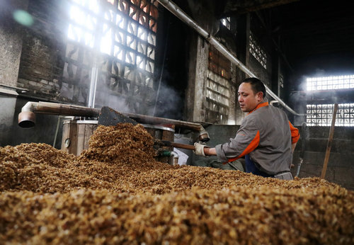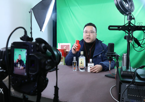 初春的玉蝉集团有限公司酿酒车间,雾气腾腾,酒香四溢,工人们干劲十足地挥动着手中的铁锹,忙着摊凉、加曲、上甑蒸馏……娴熟操作着各个加工环节;销售展示间内,琳琅满目的酒瓶摆满了货架,主播正在现场卖力地进行直播销售,呈现出热火朝天的景象。