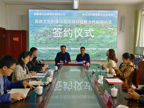 签约仪式上,乡党委副书记、乡长罗杰致欢迎词并介绍项目所在地相关情况,成都喜马拉雅科技有限公司就苗族文化村落示范区项目初步构想作了交流发言。