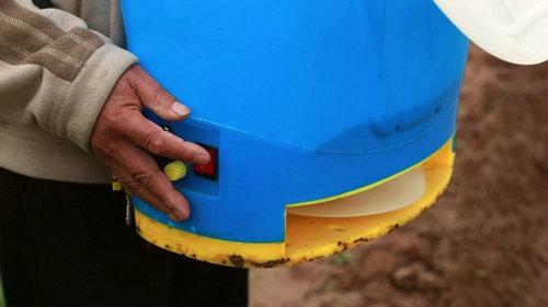 这个抛撒机操作简单,只需按照比例配备水稻种子,配好的种子装进抛撒机里,打开开关后电机转动转盘,利用离心率将谷种均匀抛撒进水田。该机器不仅用作抛撒水稻种,还可以用来施肥,一机多用,省时又省力。