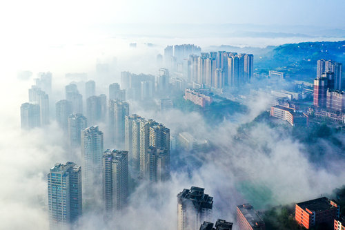 4月1日,从高空俯瞰四川省泸州市合江县城,白雾漫漫,晨曦微露,飘然欲仙,高楼、街道、桥梁像笼罩着轻纱一样,万物仿佛在仙境之中。(供稿:合江县委宣传部 李贵平)