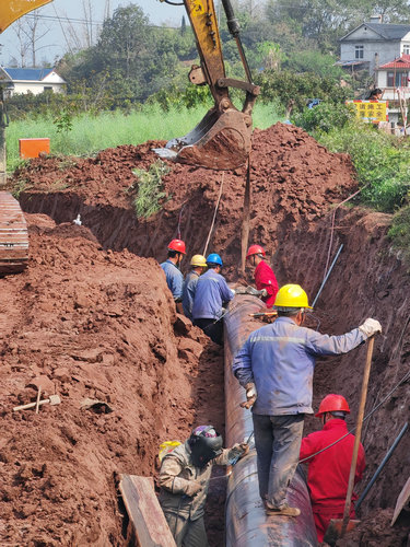 而在潮河镇潮河村4组,挖掘机来回奔走,运送管道,工人师傅们安装管道,挖掘出来的管道犹如一条长龙匍匐前行。