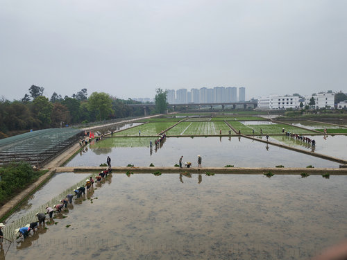 4月14日一大早,泸县玉蟾街道水竹林村基地里一片繁忙的景象!村民正猫着腰,弓着背,有条不紊插下一株株嫩绿的秧苗,播下丰收的希望。