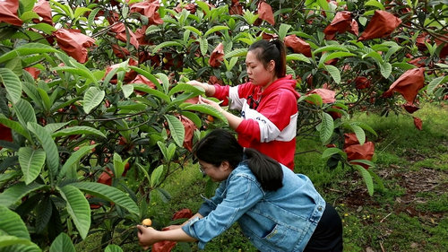 走进白沙镇忠孝村枇杷园,漫山遍野的绿意中弥漫着枇杷的甜香,一串串金黄的果实挂在枝头,村民们穿梭在林间,掀开套袋、顺势拧摘、剪去枝条、放入背篓中,很快便完成了一系列采摘工作。