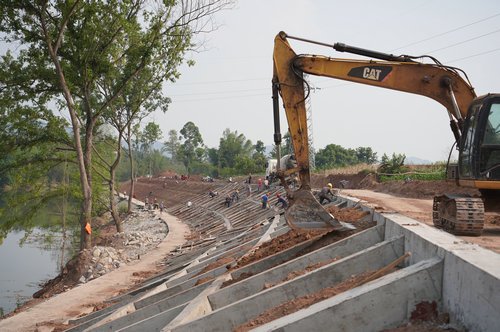 5月17日,笔者在泸县海潮镇沱江场镇段堤防工程施工现场看到,挖掘机正在河道沿岸隆隆作响,现场的工人们或是清理土方,或是进行框格梁施工,一片繁忙景象。