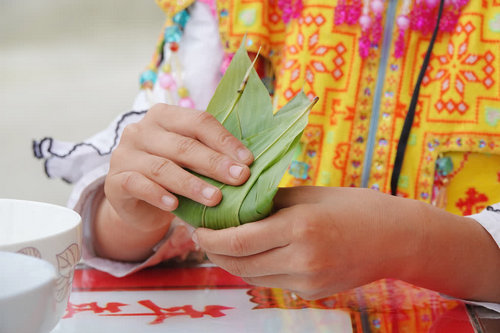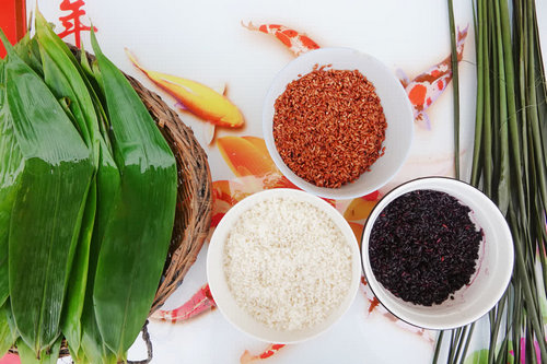 包粽子的时候,大家围坐在一起说说笑笑,气氛格外温馨和睦。取两片较大的粽叶,对折成斗型,在圆锥的筒中依次装入白色糯米、黑米、红米,上部的粽叶向下折,直到完全盖住开口为止,对折后多余的粽叶折向一侧,用一根棕叶将粽子捆绑结实即可。