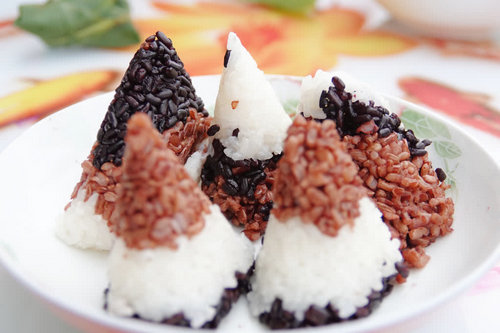 三色粽的吃法分热吃和冷吃两种。初出锅的三色粽,拆开叶子咬上一口,软滑粘牙、满口清香。冷却的三色粽,稍稍变硬,慢慢吃可给人一种醇香的口感。
