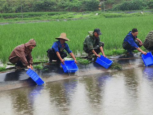 泸县海牧种养殖专合社正组织工人将大头虾苗从育苗池中捕捞上岸,通过人工分拣,运到稻田间,将一筐筐虾苗投放到稻田里。