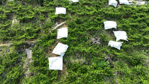 在这个丰收时节,与公路两旁热闹的采购点帐篷不同的是,片片绿海中,一顶顶银色的“帐篷”却显得格外安静,为保证果品发挥着重要作用。周光奎介绍说,园区今年投入了1000余顶这种聚雨布,主要作用是防止日晒雨淋,可以适当延长果子的采摘期3到4天。