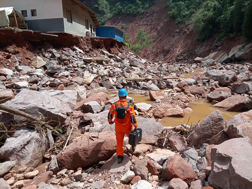 刚进龙爪村,发现原来的水泥路已被洪水冲垮。一边是湍急的河流,一边是随时可能垮塌的山体,队员们只能从紧挨山体、仅有10余厘米宽的路基快速通过。过程中,路基下方不断发生的垮塌让队员们有毛骨悚然的感觉,但没有人停步。
