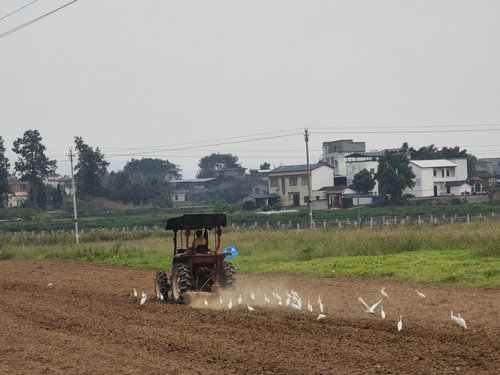 在收割南瓜后,一台耕地正在翻耕土地,为种植秋季蔬菜作准备。