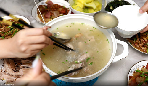 青果初嚼酸涩,后味回甘,有着清热解毒、润肺去燥的功效,和猪肚一起炖煮,中和了猪肚的油腻,青果的清香,混合着猪肚的鲜嫩,汤鲜味美,营养丰富,其独特滋味深受合江人的青睐。