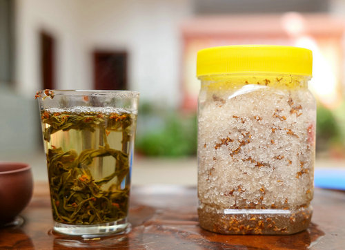 每到秋季桂花就成为了甜品店的宠儿,各种散发桂花馥郁香气的甜品令人食指大动。在桂花作为食品辅料需求旺盛的背景下,桂香村立足资源禀赋,壮大桂花产业,带动农民增收致富。“我们采摘这个桂花大概一年能摘300斤左右,收集好配送给桂花包店、月饼店、糕点店、奶茶店,按照50元一斤销售。采摘的三四年来,村民每次都把桂花里的叶子和垃圾清理的比较干净,所以新老顾客都对我们比较信任。”村民孔蔺会说道。孔蔺会正忙着将筛选好的鲜桂花与白砂糖融合到一起,做成桂花蜜。“这样放置三个月就可以食用,还能美容养颜。”孔蔺会说。