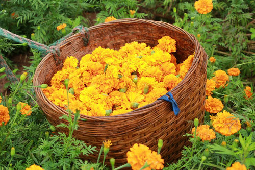 走进花海,一朵朵金灿灿的万寿菊错落有致,开得正是绚烂,空气湿润而清新,带着万寿菊淡淡的花香。花海中,三五成群的村民背着背篓,身穿雨衣穿梭其中,娴熟地采摘下一朵朵娇艳的万寿菊。