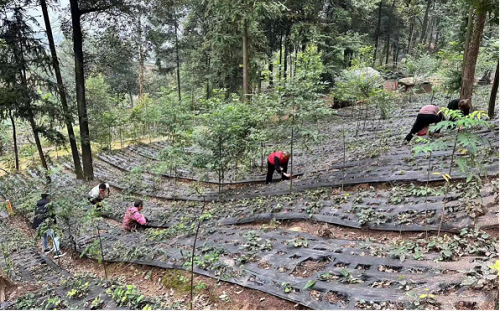 回乡后,王洪涛第一个解决的问题就是种植什么中药材。2020年初,他邀请成都科学院专家到新洋村实地考察,从气候、地形、土壤、水质等方面综合分析研判,最终将淫羊藿作为主导产业。经过充足的前期准备,2021年9月,淫羊藿正式扎根在新洋村的土地中。经过两年的发展,目前淫羊藿种植面积达500余亩,基地长期聘用10余名村民,且会根据农时不定期增加临时工。