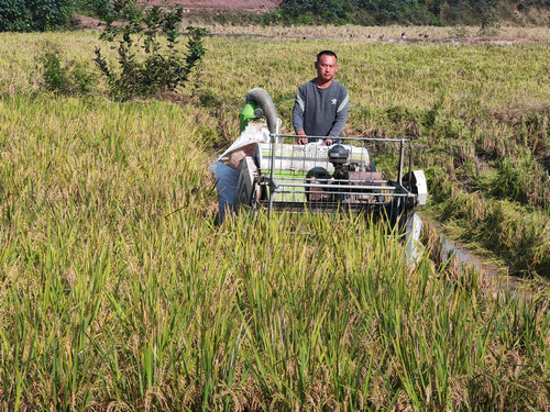 “今年的这块田的再生稻更好,去年收割7、8百斤,今年保守一点可能收得到1000多斤。”泸县潮河镇五谷寺村村民武正伦驾驶着收割机正在收割再生稻,他除了收割自己的,还以每亩150元的价格帮助其他村民收割。