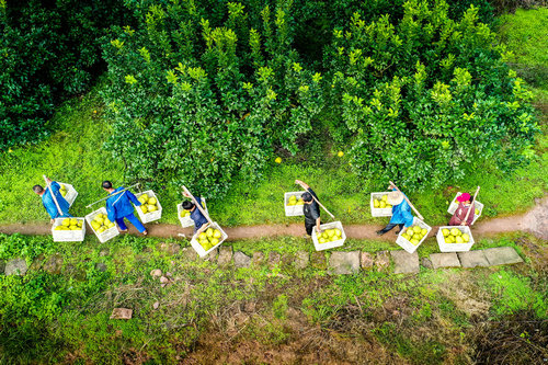 2023年11月7日,合江县望龙镇三益真龙柚现代农业园区,村民穿梭在柚子林里忙着采摘、运送、分拣柚子,通过各种营销方式销往全国各地。(供稿:合江县委宣传部 李贵平)