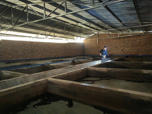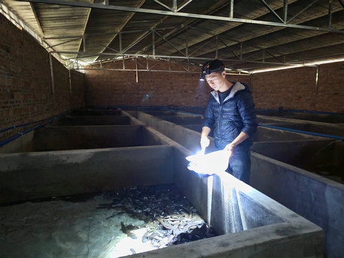 “这里生活着大大小小的娃娃鱼差不多有15000多只。”杨建章说,这几百平方米的室内养殖场没有灯,几乎是一片漆黑。“因为娃娃鱼害怕光线,黑暗的环境才有利于它们生长。”杨建章说,“老家有一条以前的涵洞,想把它利用起来养娃娃鱼。”