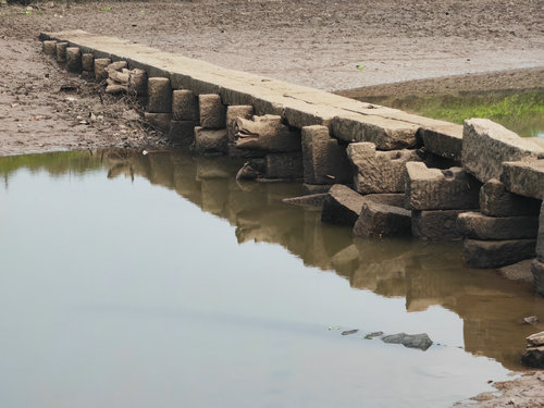 在钟滩桥上游100米处河道,一座石板桥露出苍老的容颜。踩着淤泥,我们来到桥上,粗略一数,小石桥有桥面石38块(其中有两两块断裂、跌入河中),除开桥头堡有18个桥墩,第6个桥墩和12个桥墩有龙头、龙尾,全桥长40米左右。由于水土流失,河道改道,两个桥头堡前的道路已经无踪迹。河水在正常水位,小石桥就见不到影子。