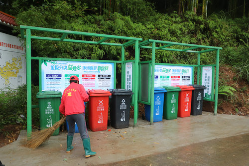 在现场看到,分类垃圾亭内正方、两个侧面墙上张贴了宣传标语,亭内依次摆放了红、蓝、绿、黑四个色彩的垃圾桶,崭新的四色分类垃圾桶既方便居民投放垃圾,又方便分类收运,周边环境也更加干净整洁。“垃圾亭一改以往风吹过后一股刺鼻气味的状况,现在臭味没了,也变得美观和整洁了。”村民刘正友点赞。