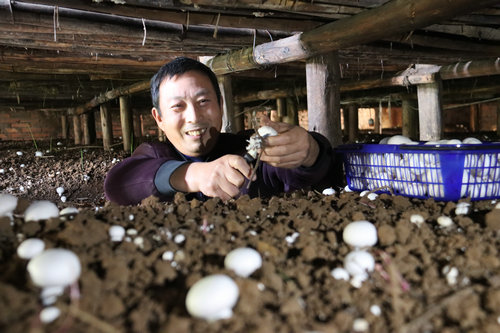 四川新闻网消息 12月22日,在纳溪区石银村2社双孢菇种植大户宋世江的菇房里可以看到,梯台式的菇床上,洁白的双孢菇长势喜人,宋世江和工人正在忙着采收成熟的双孢菇,脸上洋溢着丰收的喜悦。