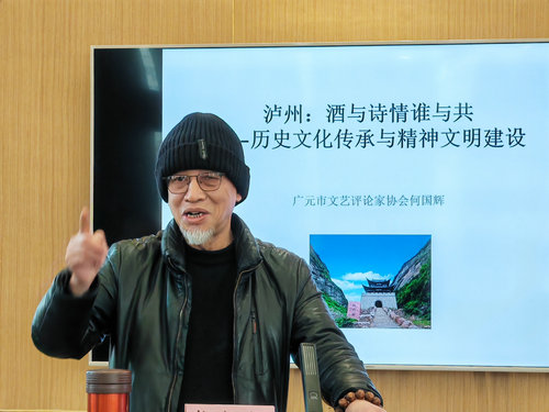 | 广元市评论家协会主席何国辉作《泸州:酒与诗情谁与共——历史文化传承与生态文明建设》讲座(曾佐然摄) |
