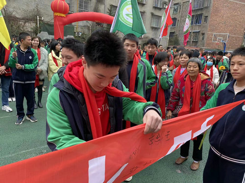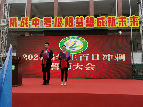 “亲爱的爸爸妈妈,您放心吧。孩儿已经长大,我一定要用自己最理想的中考成绩把您们报答!”“尊敬的家长,请您们放心吧。我们一定竭尽全力,认真上好中考复习的每一堂课,认真辅导好每一位学生,让他们都能够在中考中考出自己最为理想的成绩,升入自己理想的学校。”在誓师大会上,全体初三学生和教师纷纷宣誓,表达出冲刺中考的决心和信心。