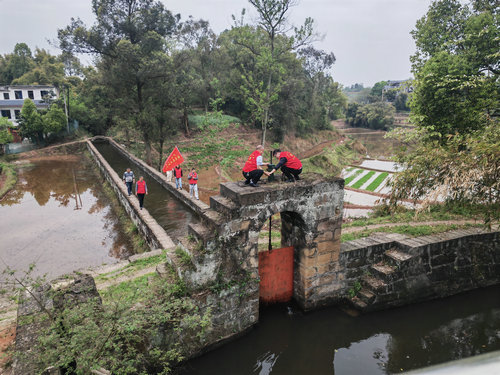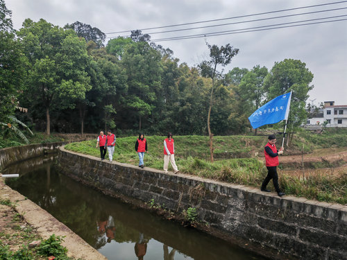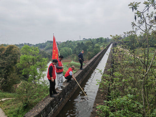 泸县水务局机关三支部的党员志愿服务队沿着渠道巡逻,发现垃圾及时清除,发现渗漏险情及时上报。
