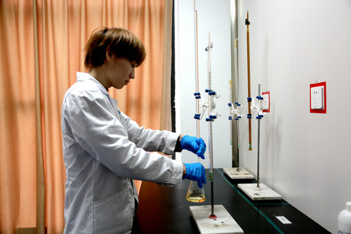 近日,小编走进四川奇格曼药业有限公司(以下简称“奇格曼药业”)实验室,身着白色大褂的研究员正在操作着滴定实验,黄色的液体正缓缓地滴入下方烧杯中。