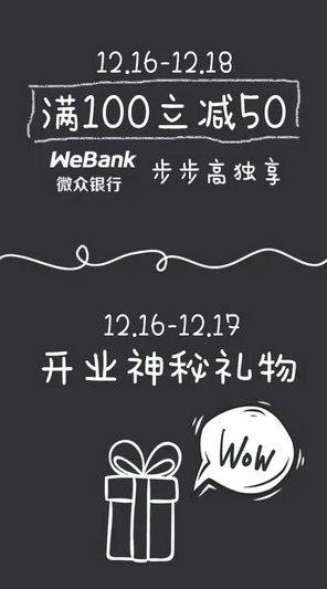 活动期间,步步高携手腾讯微众银行,强强联手,凡在步步高泸州新天地超市使用微众银行卡支付的新用户立享满100减50!单个身份证用户仅限参与1次,数量有限,先到先得。