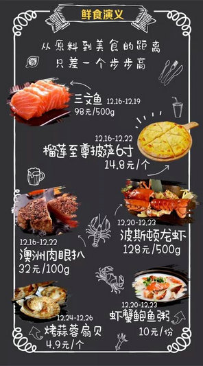 鲜食演义在湖南已有16家步步高超市在运营,进入四川尚属首次。该项目的特点是将餐饮引入超市生鲜区,消费者购买了帝王蟹、大闸蟹、波士顿龙虾、三文鱼等海鲜以及牛排等生鲜产品,可以直接在超市内加工并食用,该项目被称为中国超市版的共享厨房。