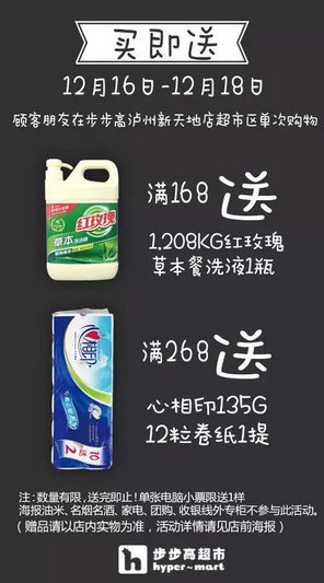 活动期间,凡在步步高泸州新天地负一楼超市单次购物满168元即送1.208kg红玫瑰草本餐洗液1瓶;满268元即送心相印135g12粒卷纸1提。