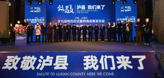 四川新闻网泸州1月12日讯 今(12)日,在有着“中国龙文化之乡”的美誉的泸县,一场泸县商业里程碑事件——万福大都汇主力店签约仪式暨招商成果发布会在泸县天展温泉大酒店成功举办。泸县人大副主任余冰、县政府副县长杨开春、县政协副主席廖兴无,及泸县经济开发区管委会主任蒲云贵、县商务局局长杨凤英、县工商联主席郑尚贵、县投资促进局纪检组长邱旭光,与万福集团董事长付学银、董事长助理傅韬、总经理文锋等出席了本次发布会。