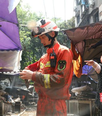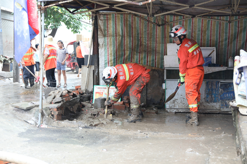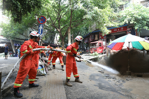 | 贵州省遵义市驰援龙马潭区的消防官兵正在小市街道沿江路开展清淤作业 杨尚威摄 |