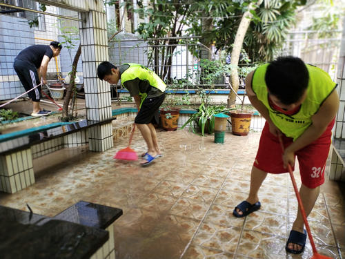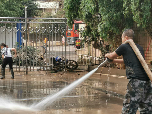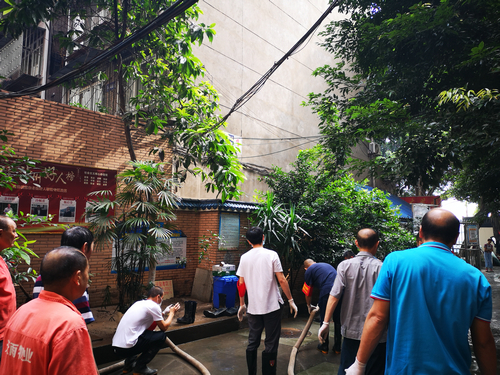 清淤工作必须在一边退水一边冲洗清扫过程中开展,把握时机至关重要,过早过晚只会徒增烦恼,所以我市物业人不畏艰辛不分昼夜24小时开展灾后重建工作。