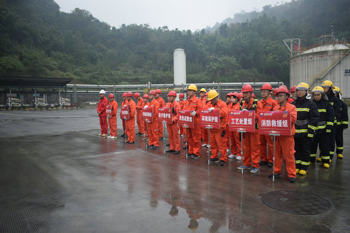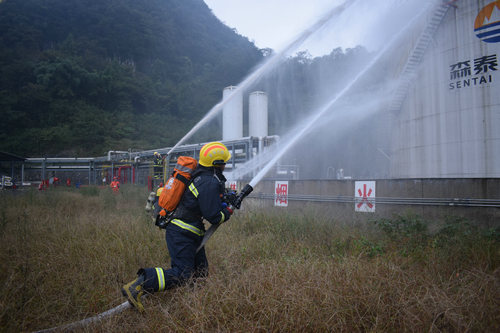 “各小组按照LNG重大危险源泄漏处置方案。佩戴相应的应急救援装备,开展LNG泄漏抢险工作!”随着救援指挥部一声令下,各救援人员按分工不同迅速佩戴救援设备,并在消防队员水枪掩护下进入事故现场开展救援与抢险工作,最后由环境保护组对现场可燃气体浓度进行检测,并对喷淋降温、稀释消防水全部集中收集到事故水池。