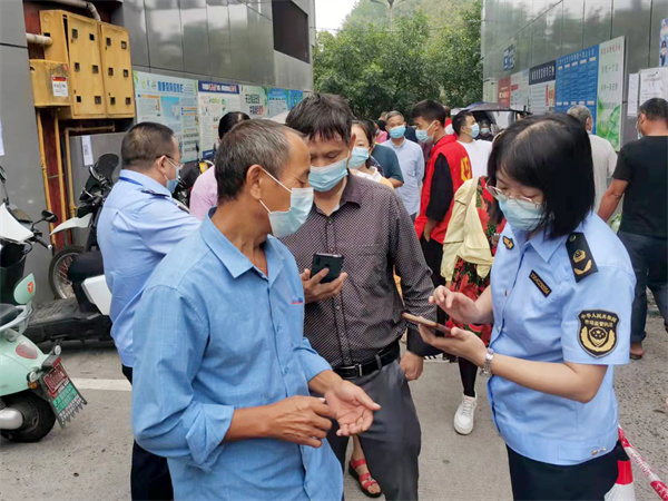 “静态管理期间,农贸市场是疫情防控的重点。今天又是中秋节,市场人流量比较大,防疫要求容不得半点马虎。”胡晓云说,“我们6点钟就来了,主要是督促群众戴好口罩、‘一扫三查’和查验出入证明,过程稍微有点繁琐,好在群众防护意识比较强,都能积极配合。”