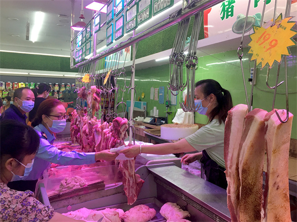 “节日期间,群众对猪肉的消费需求比较旺盛,近期猪肉价格一直都是群众关注的焦点。封控期间,我们每天都会对辖区的农贸市场、便民交易点、商场超市进行巡查检查,实时记录、上报猪肉价格。”税先说。