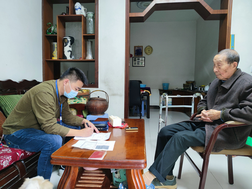 11月9日,龙马潭区小市街道退役军人服务站工作人员来到杨大顺家,上门为他办理退役军人优待证。