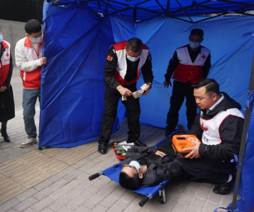 演练模拟发生灾害时,紧急开展应急救援演练,开展搭建应急帐篷,对受伤群众开展包扎、心肺复苏、AED模拟使用、担架救援等现场救助和医疗救助等。
