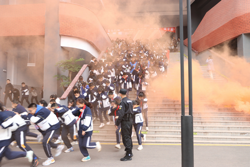当警报声响起,各班任课教师沉着冷静,指挥学生从教室前后门鱼贯而出。学生迅速躬身、捂住口鼻、依次搭肩,按照预定路线不惊慌、不推不挤,井然有序的撤离到校园安全地带。全校2600余名师生安全撤离,共用4分30秒,有效的提升了师生灾害安全逃生速度。