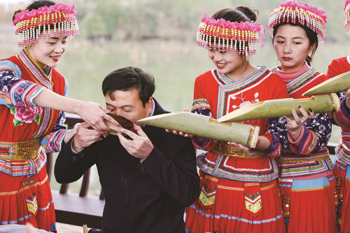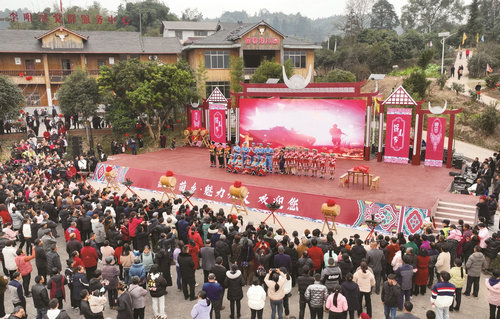 四川新闻网消息 2月21日,“红色苗乡·魅力九支”苗族踩山节活动在合江县九支镇李咀村举行。一碗碗清冽甘甜的米酒伴着苗家祝酒歌,香飘李咀村民族文化广场,苗族儿女身着盛装,欢聚一堂,吹笙弄笛、载歌载舞,庆祝苗家传统节日踩山节,欢迎四方宾客共迎新春。