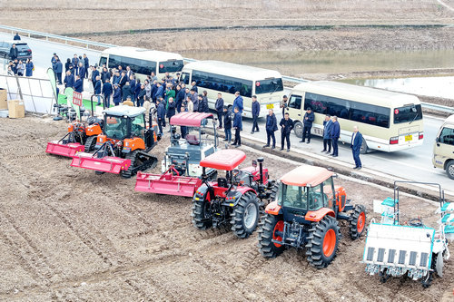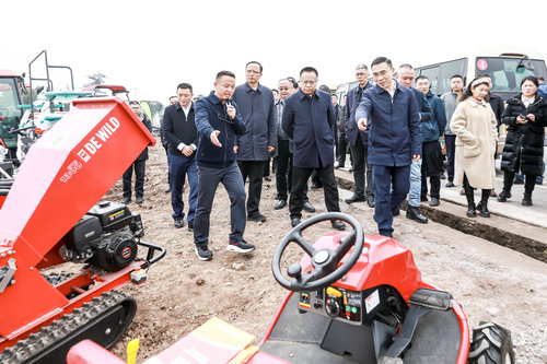 | 泸州市合江县白沙镇芦稿村高标准农田项目现场,参加全市春耕生产的与会人员在参观展示的各种农机具 |