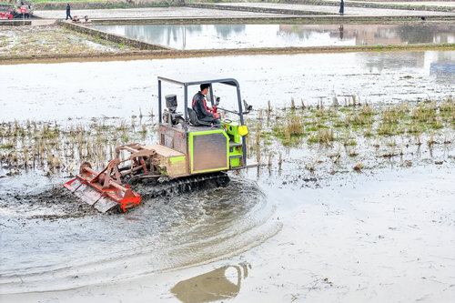 | 泸州市合江县白沙镇马鹿村,高标准农田建设现场,农机手驾驶旋耕机在耕田 |