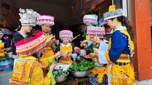 在活动的热烈氛围中,只见粽叶翻飞,犹如绿色的舞裙在微风中轻舞,而线绳则如同灵巧的精灵,穿梭于粽叶之间,编织出一个个精美的粽子。每一个粽子都融入了苗乡儿女对美好生活的向往和祝福。与此同时,现场还设有苗族芦笙舞表演,欢快的芦笙和优美的舞姿让每个人都沉浸在传统节日的欢乐与美好之中,展现了苗族文化的独特魅力。