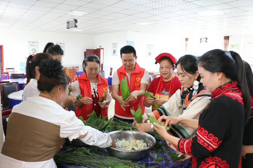 “苏木地为哦,角波各拉索,你哦嘎达索,莫拉嘎得波,你木嘎节勒,支节波哥大......”一曲《彝族敬酒歌》拉开了活动的序幕。伴随着欢快的歌声,大家来到干部职工食堂包起了粽子。工作人员早已把准备好的糯米、蜜枣、粽叶等整齐地摆放在桌子上。大家围在一起,纷纷拿出看家本领。志愿者手把手教着不会包的同志们,传递端午安康的节日温暖,大家的脸上都洋溢着快乐的笑容。叠粽叶,盛米,缠粽叶的草绳在飞舞着,包好的粽子一个个地摞在盆里。不一会儿,三角粽、四角粽等形态各异的粽子迅速成型。活动结束后,工作人员将煮熟的粽子送给了离退休干部和彝族同胞们,香甜的粽子传递了浓浓的关爱之情。